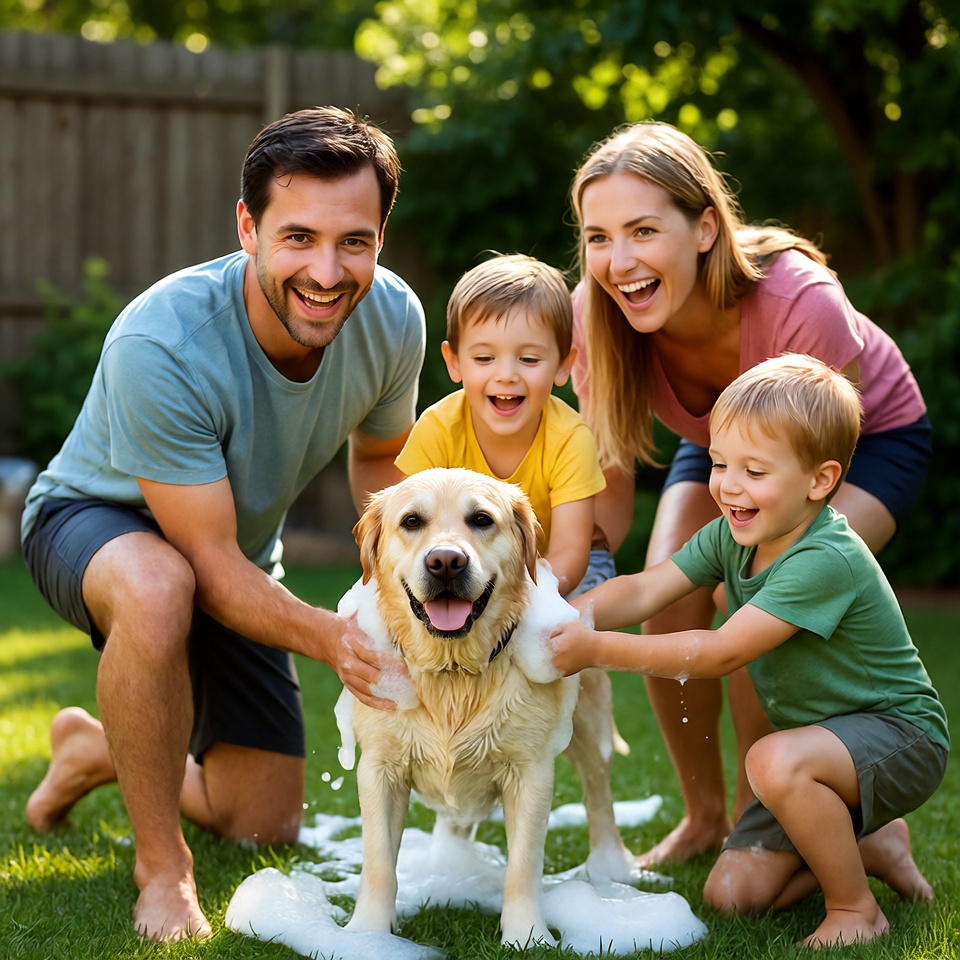activity, backyard, bubbles, children, dog, family, friendship, fun, grooming, happiness, joy, kids, nature, outdoor, parents, pet, play, summer, sunny, wash