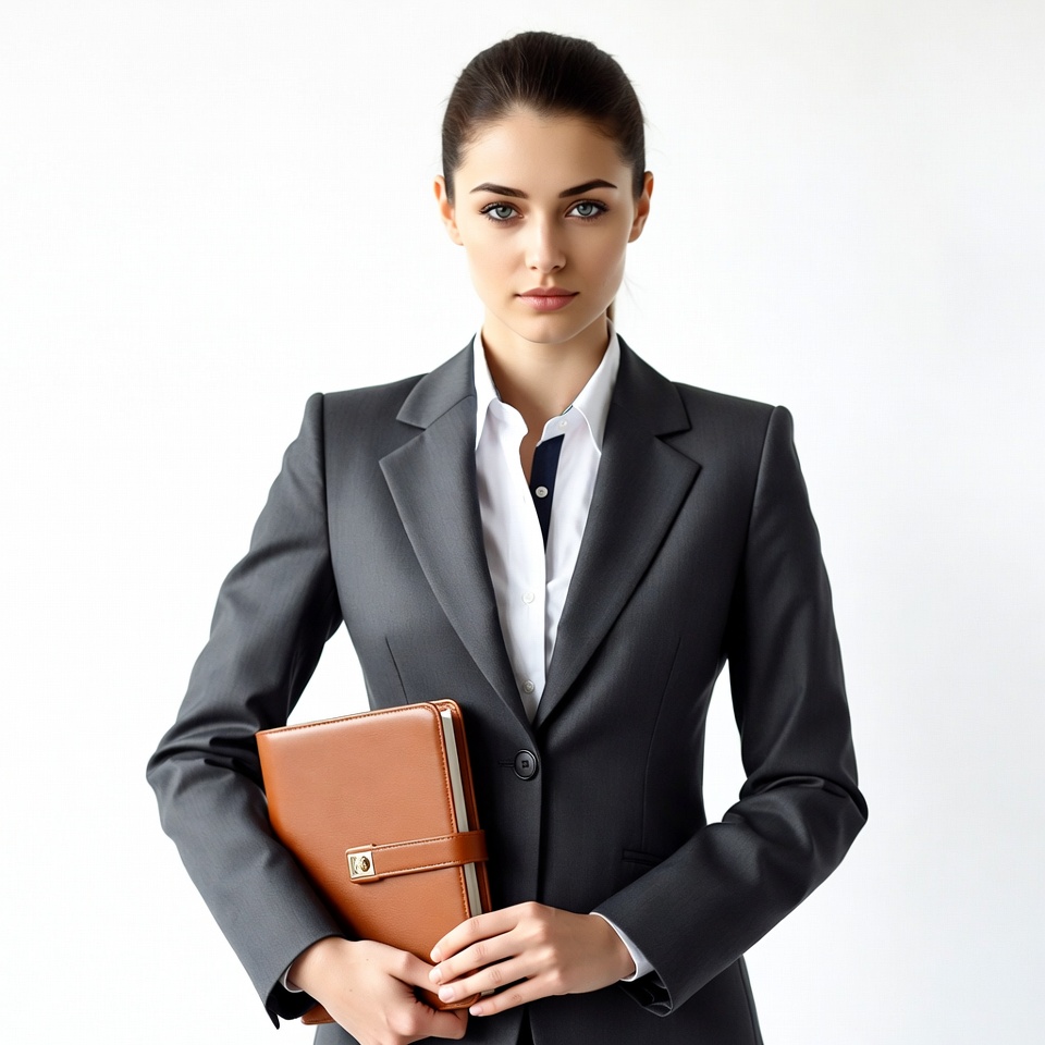 attire, brown, business, confidence, corporate, expression, fashion, folder, formal, hairstyle, looking, pose, professional, serious, standing, studio, suit, woman, workspace, youth