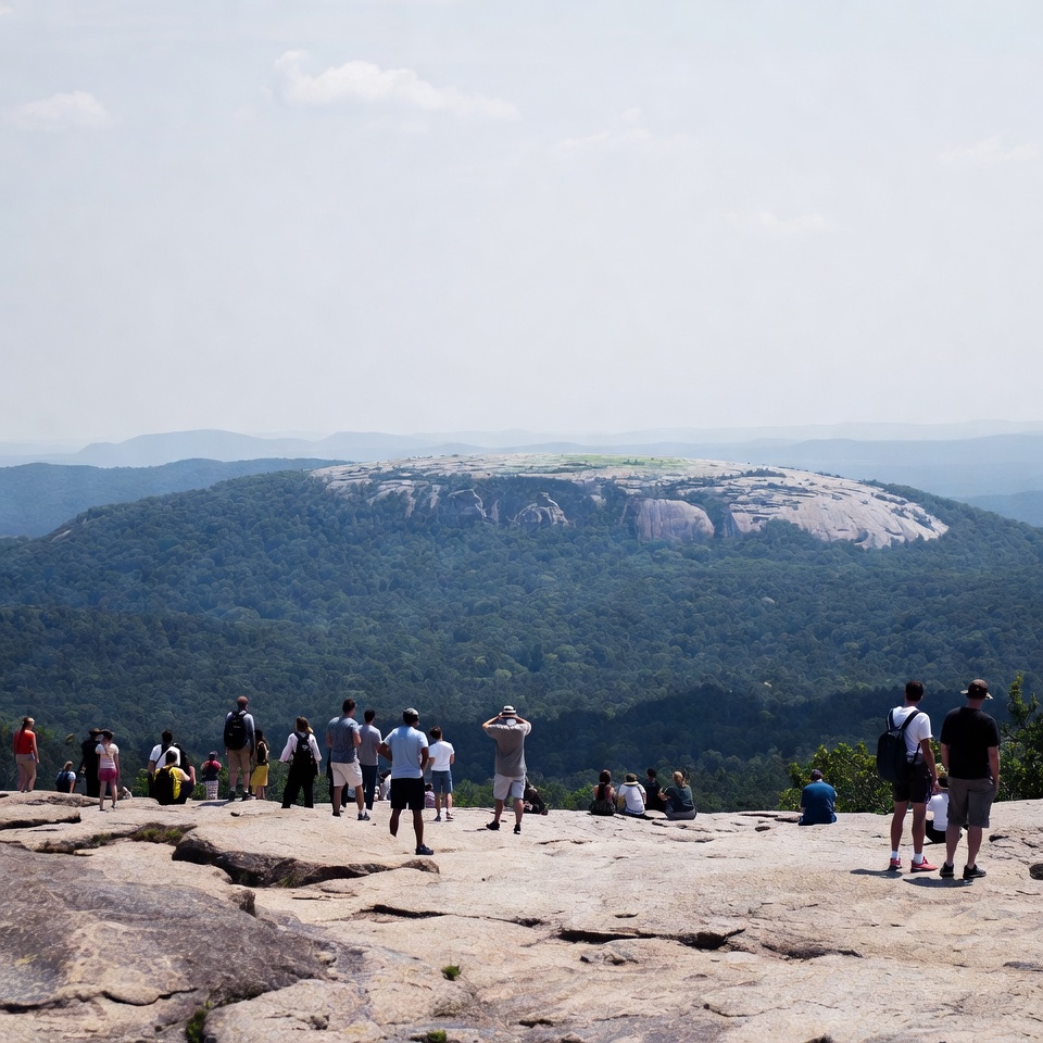 Many hikers stand on a rocky summit looking at a distant mountain and wooded area during a bright day. They appear to take photos and relax.