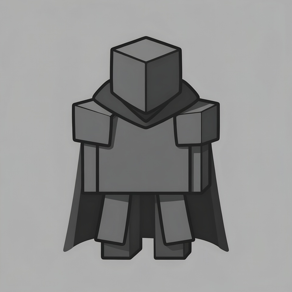 A simple hero character stands with block-like features and a cape. The design uses gray colors without detailed expressions or background.