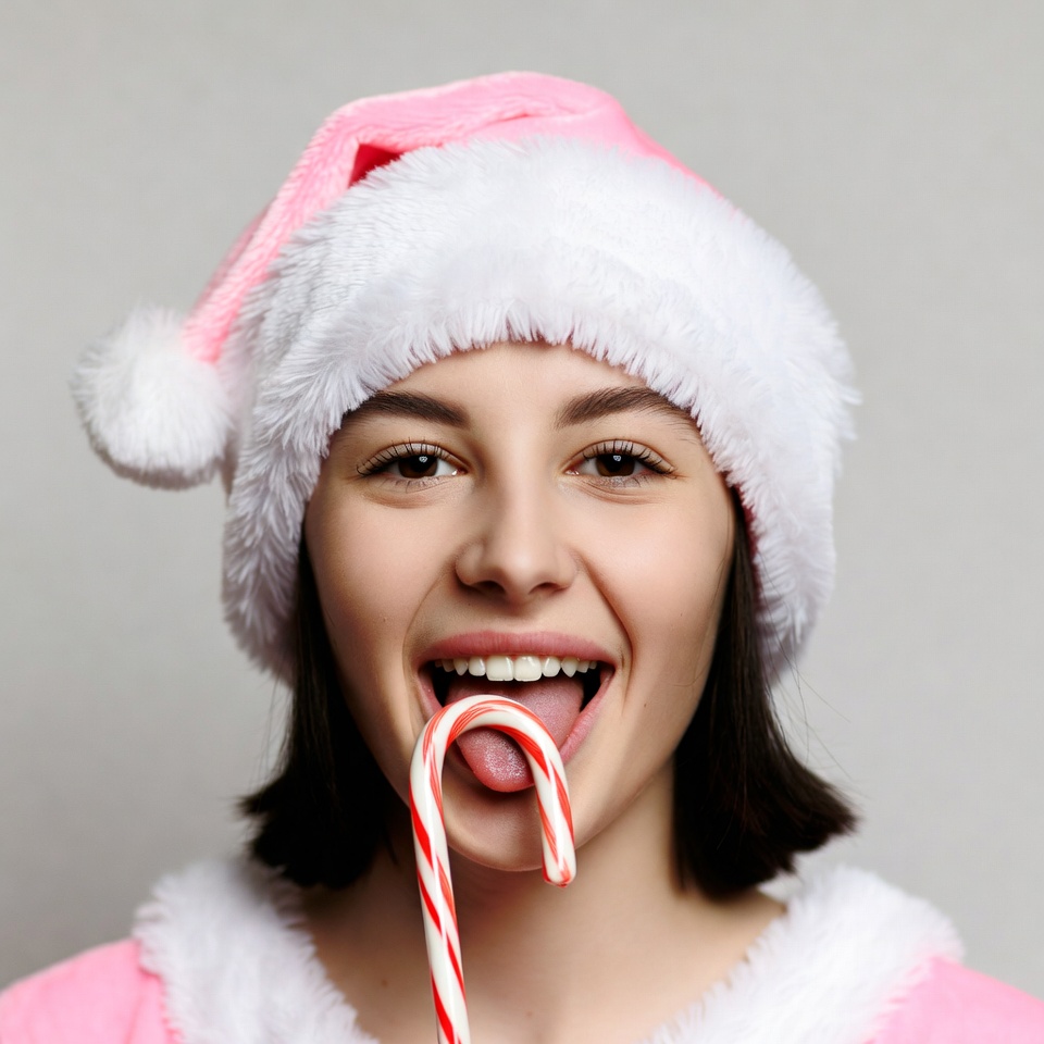 A girl wears a pink Santa hat while holding a candy cane with her tongue. She smiles and shows excitement during the holiday season.