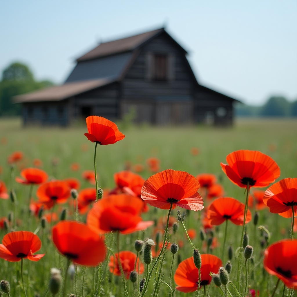 agriculture, barn, blooming, bright, bright red, countryside, farming, field, flowers, garden, green, landscape, nature, outdoors, petals, poppies, rural, sky, spring, wooden