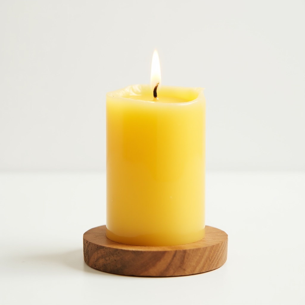 A yellow candle burns steadily on a round wooden base, casting a warm light in a simple indoor setting.