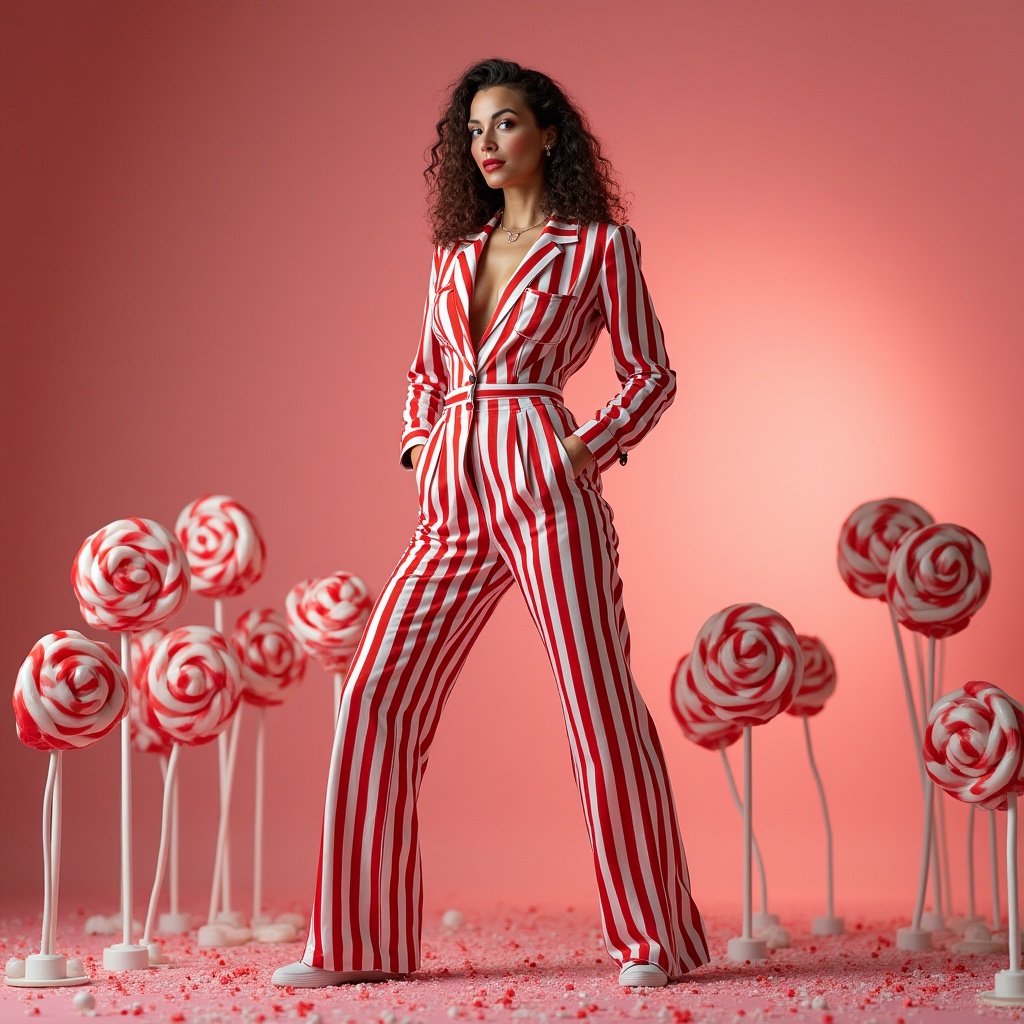 A model stands confidently in a striped suit, surrounded by colorful lollipops on a vibrant background during a creative photoshoot.
