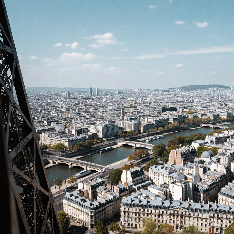 A person stands on the Eiffel Tower, observing a wide view of Paris. The Seine River flows through the city, surrounded by buildings and trees.
