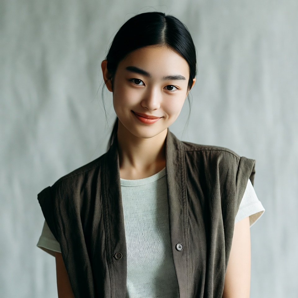 A young woman stands indoors smiling softly. She wears a simple outfit and has long black hair. The background is plain and muted.