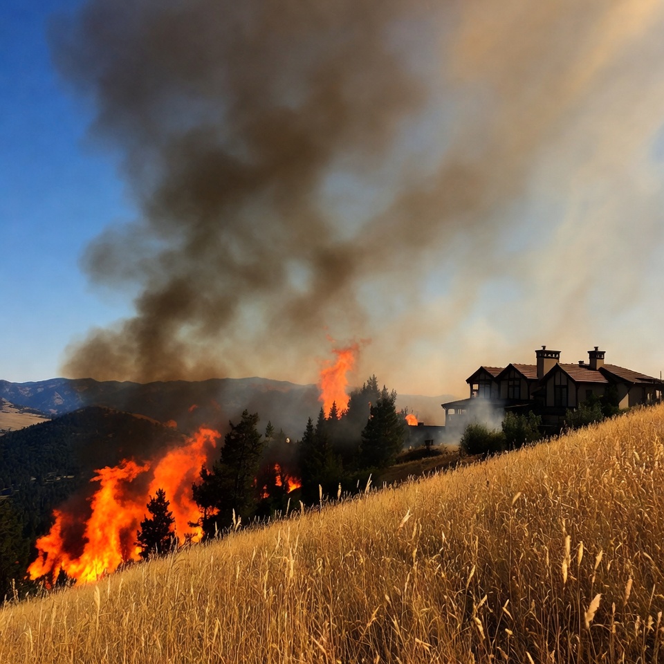 Flames and smoke rise from a wildfire threatening a mountain home. Dry grass surrounds the area on a sunny day.