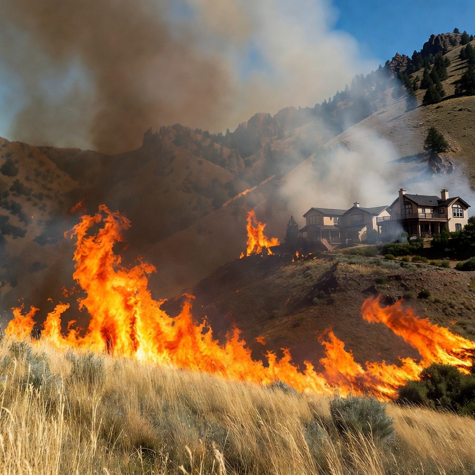 Flames spread across grass and shrubs near houses on a mountain. Smoke rises into the sky as fire threatens nearby buildings.