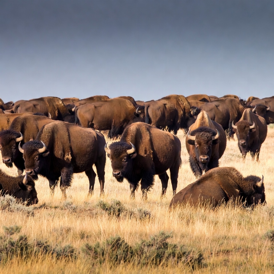 Bison graze in a large herd on open grassland under a cloudy sky. Some are resting while others are standing and watching.