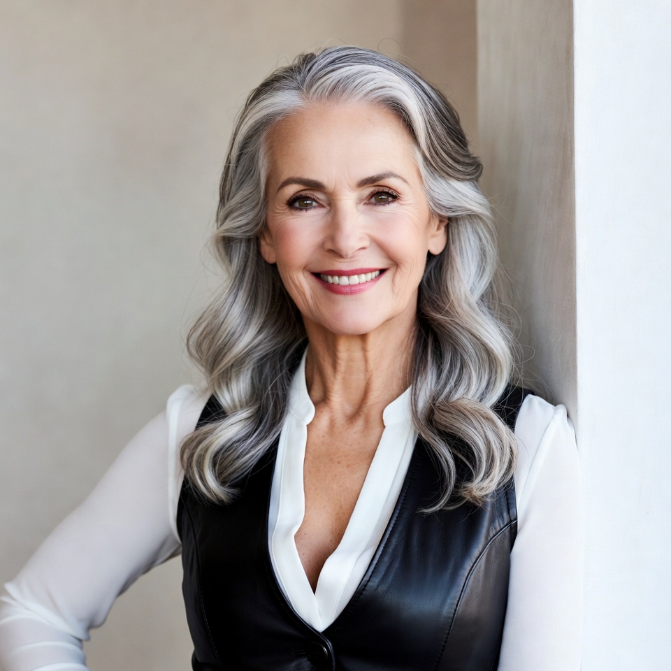 A woman stands by a wall and smiles. She has long gray hair and wears a black vest over a white shirt. Soft light brightens the space.
