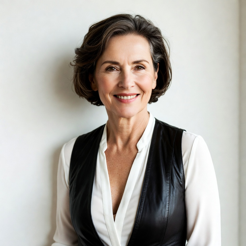 A woman stands confidently near a wall, smiling directly at the camera. She wears a stylish outfit and has a warm expression.