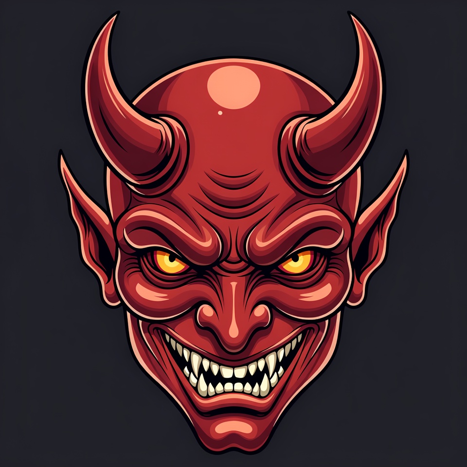 A red demon head shows sharp horns and menacing eyes. The expression reveals anger and malice. The background is dark, emphasizing the figure.