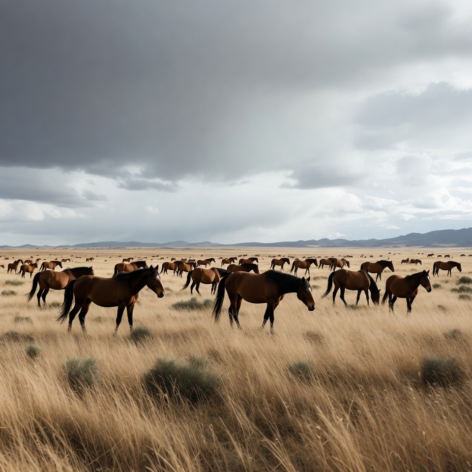 animals, cloudy, cloudy sky, countryside, equine, fauna, field, flora, grass, grazing, habitat, herd, horses, landscape, nature, open space, prairie, rural, wild, wildlife
