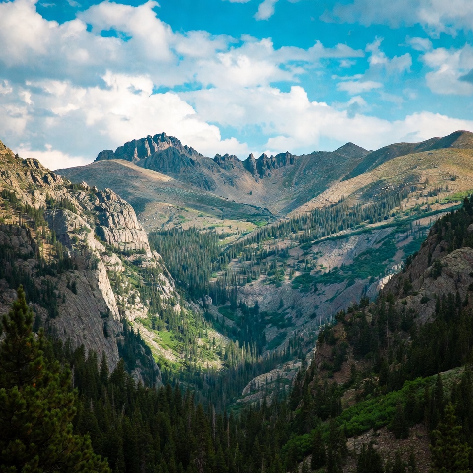A view of the Rocky Mountains shows steep cliffs and green valleys under a partly cloudy sky. The scene captures nature's beauty.