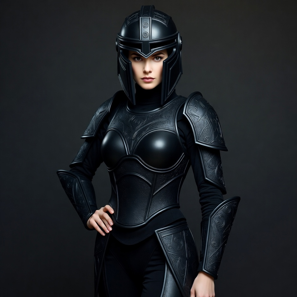A person stands confidently in black armor and helmet. The background is dark, highlighting the armor's details and the pose.