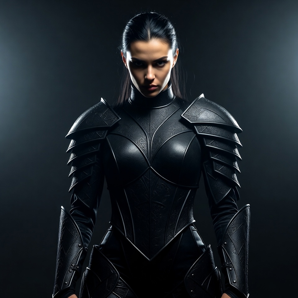 A person stands in dark armor, displaying strength and confidence. The background is dim, highlighting the detailed design of the armor.