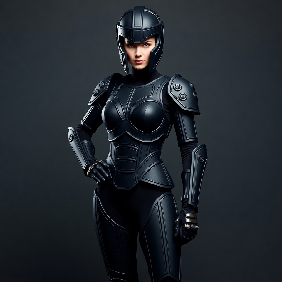 action, armor, black, character, confident, costume, dark, design, female, futuristic, helmet, modern, outfit, pose, protection, sci-fi, strength, suit, technology, warrior