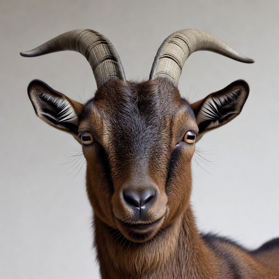 A goat with curved horns poses in a simple indoor setting, looking directly at the viewer with a curious expression.