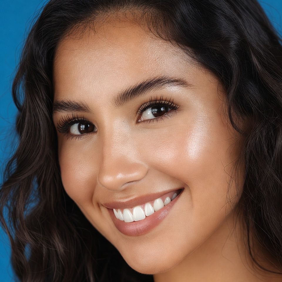 A young woman smiles brightly. She has curly hair and glowing skin. The background is blue, creating a lively atmosphere.