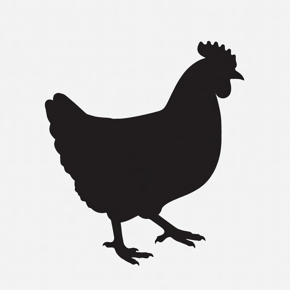 A black silhouette of a chicken stands against a white background, showcasing the shape and features of the bird clearly.