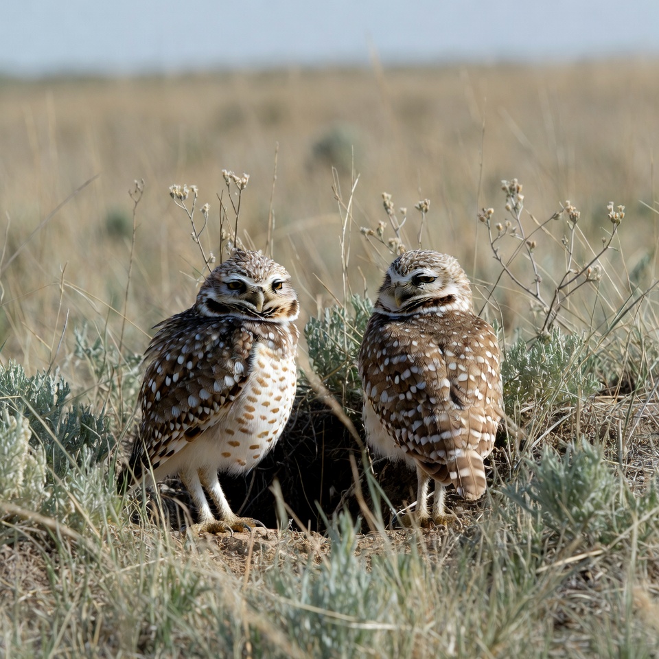 Two burrowing owls stand near their nest in a field. They are facing each other and checking their surroundings under the sun.