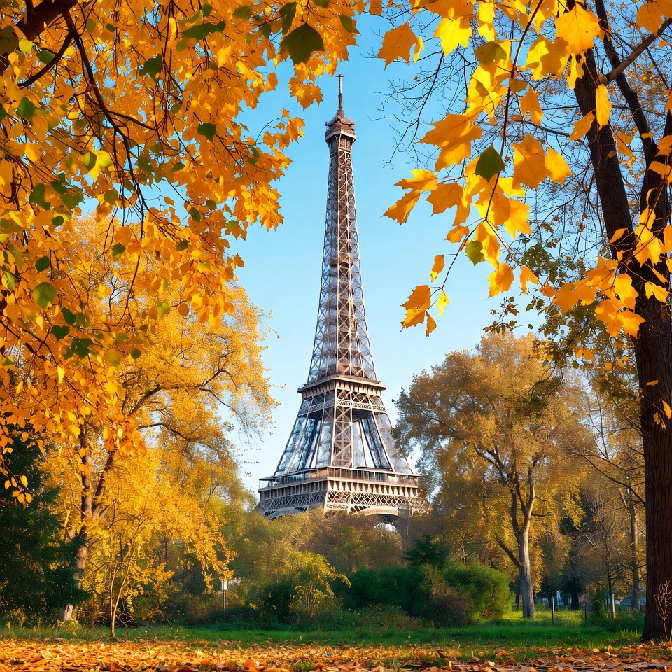 Eiffel Tower stands tall among bright autumn leaves in Paris, capturing a clear day with vibrant colors and trees surrounding the landmark.