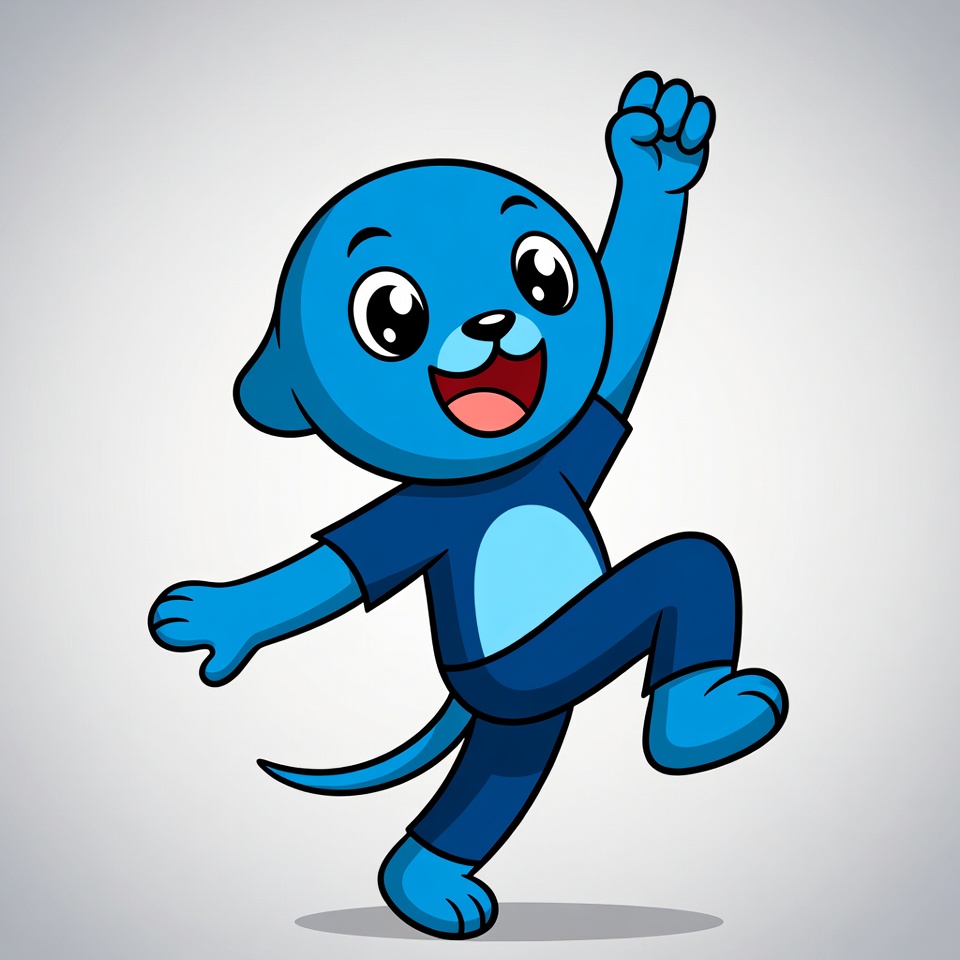 A blue cartoon character smiles and raises one arm while standing on one foot. The character wears a blue outfit and displays excitement.