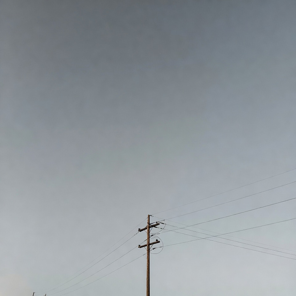 Power lines stretch across a gray sky, showing the simplicity of urban infrastructure on a cloudy day.