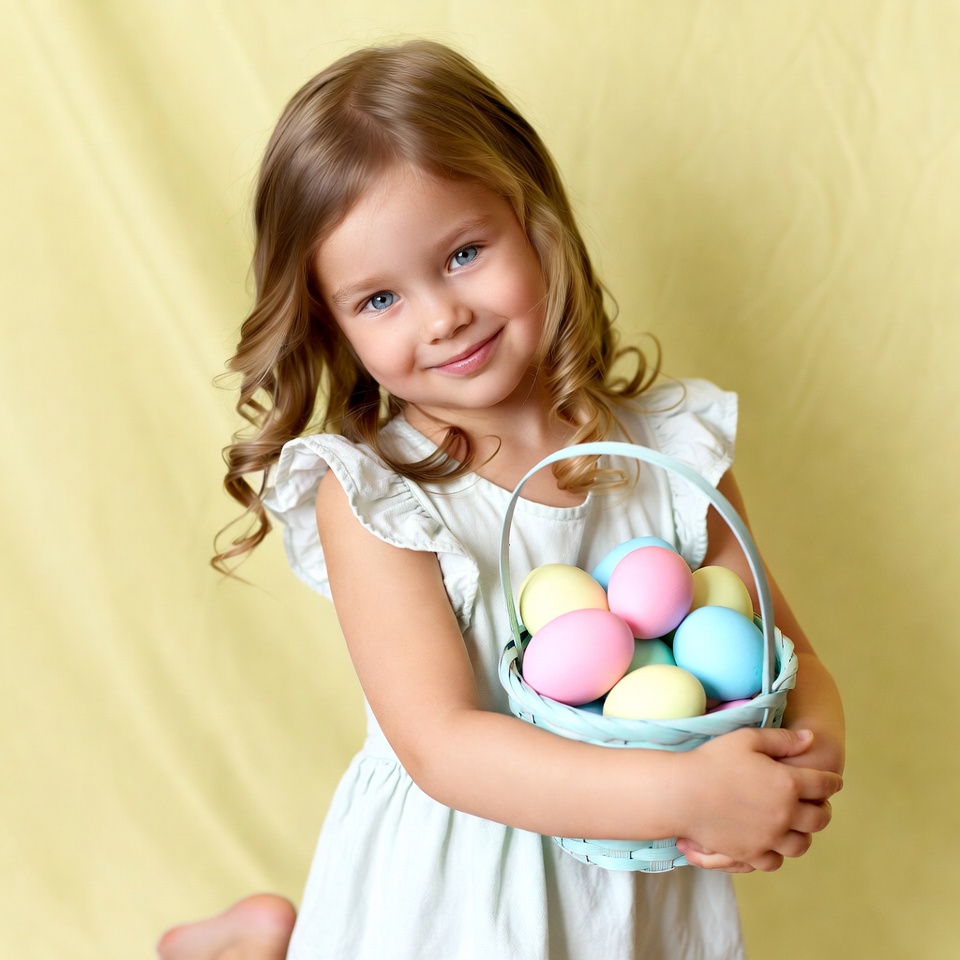 A young girl smiles while holding a basket filled with colorful Easter eggs against a yellow backdrop. She has curly hair and wears a light dress.
