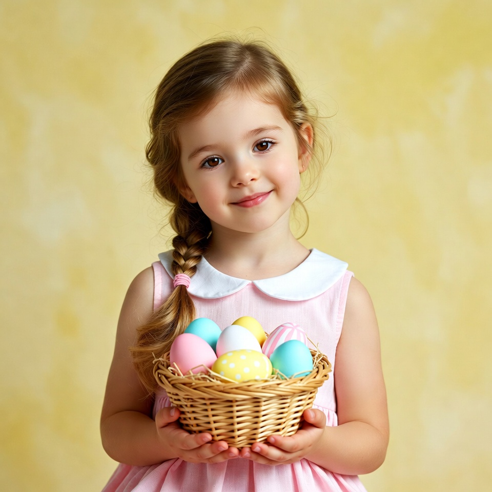 basket, celebration, childhood, colorful, cute, decorating, dress, eggs, festive, fun, girl, happy, holiday, indoor, joyful, kid, pastel, smile, spring, traditional