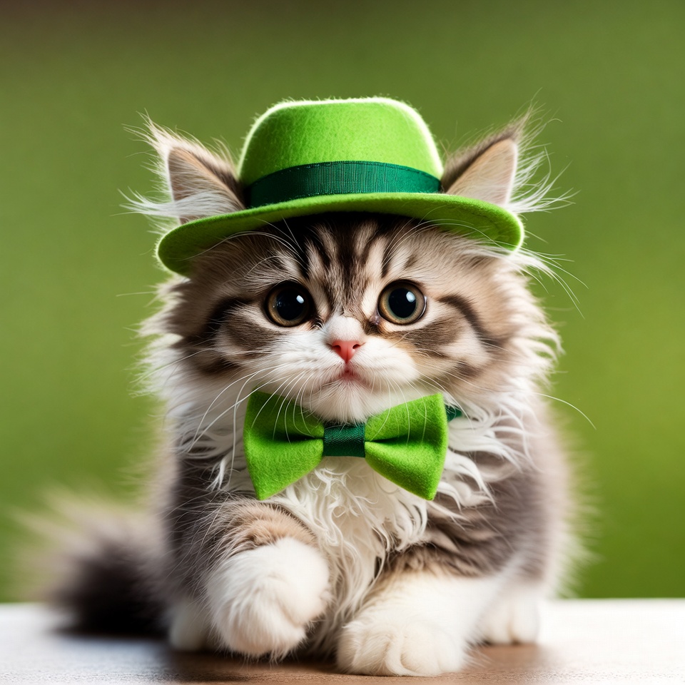 Kitten wearing green hat and bow tie