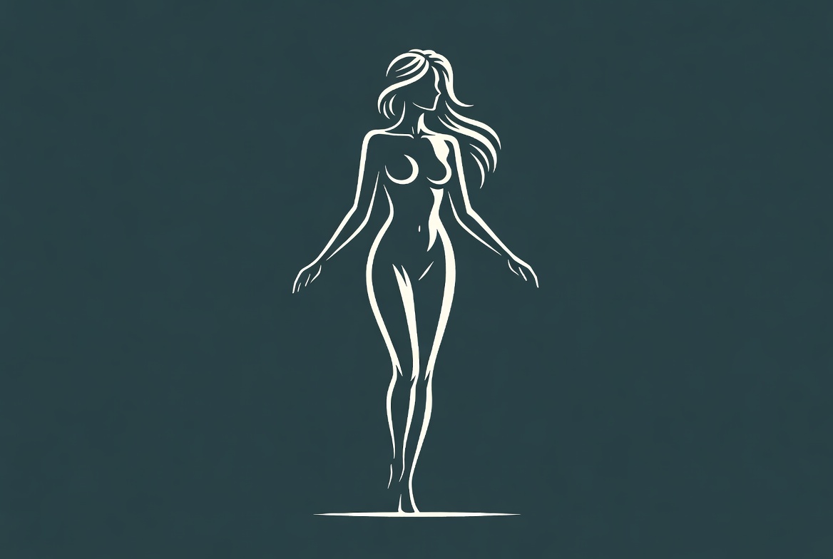 A figure of a woman stands with arms open, showcasing a minimalist design on a dark background.