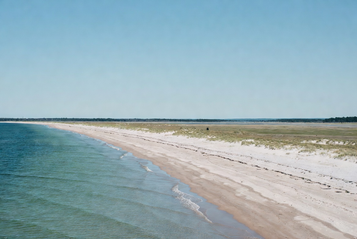 Sand stretches along the shore with clear blue water under a bright sky. The landscape shows a calm beach scene at midday.