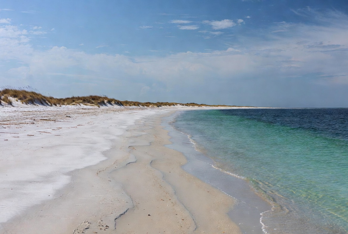The shoreline curves gently with white sand and green water under a clear sky. Waves lap softly at the beach edge.