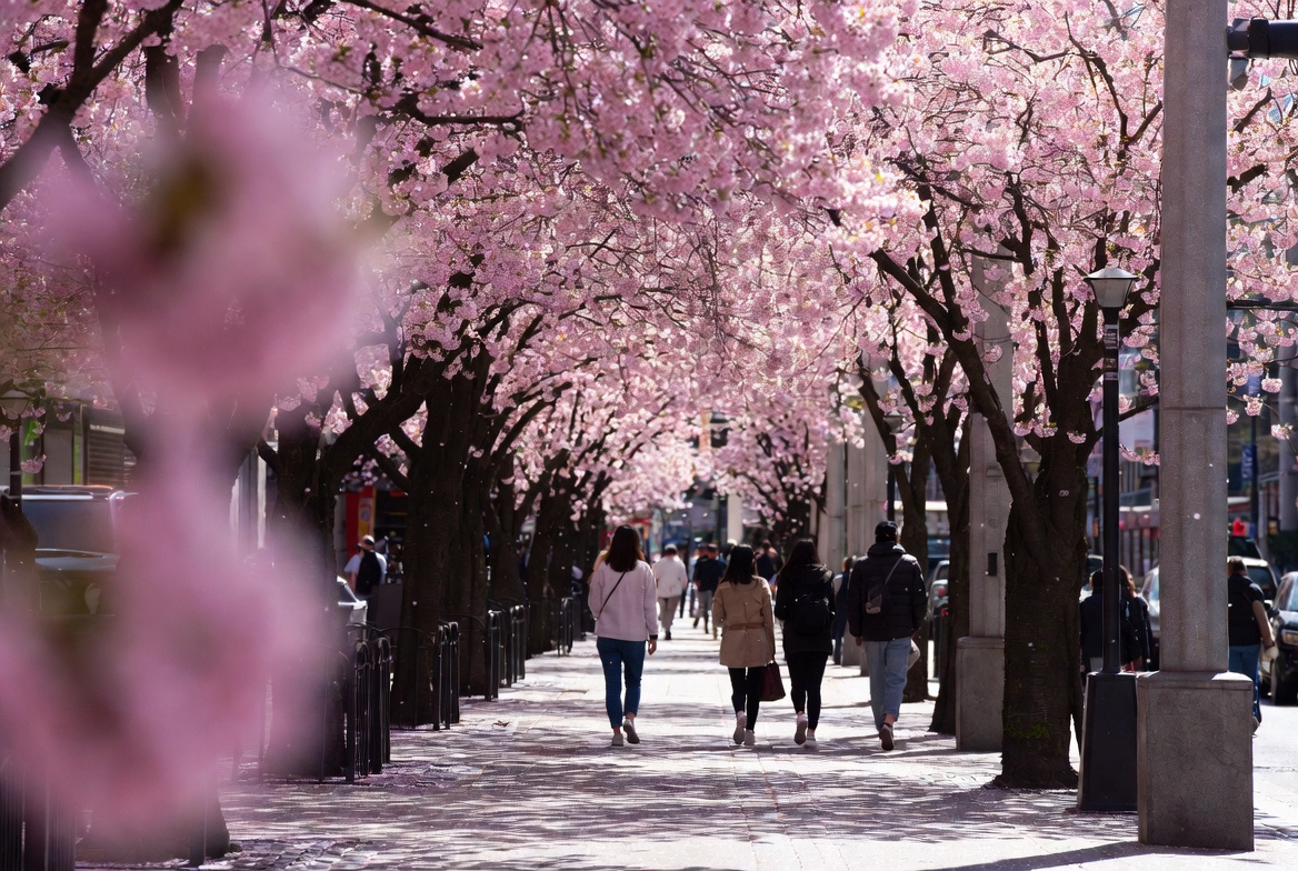 bloom, cherry blossom, city, flowers, landscape, nature, outdoors, park, people, petals, scenery, season, spring, street, sunlight, tourism, travel, trees, urban, walking