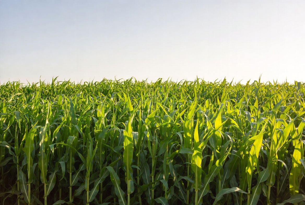 Rows of tall corn plants grow in a field under a bright sky during the evening. The scene shows green leaves and open space.