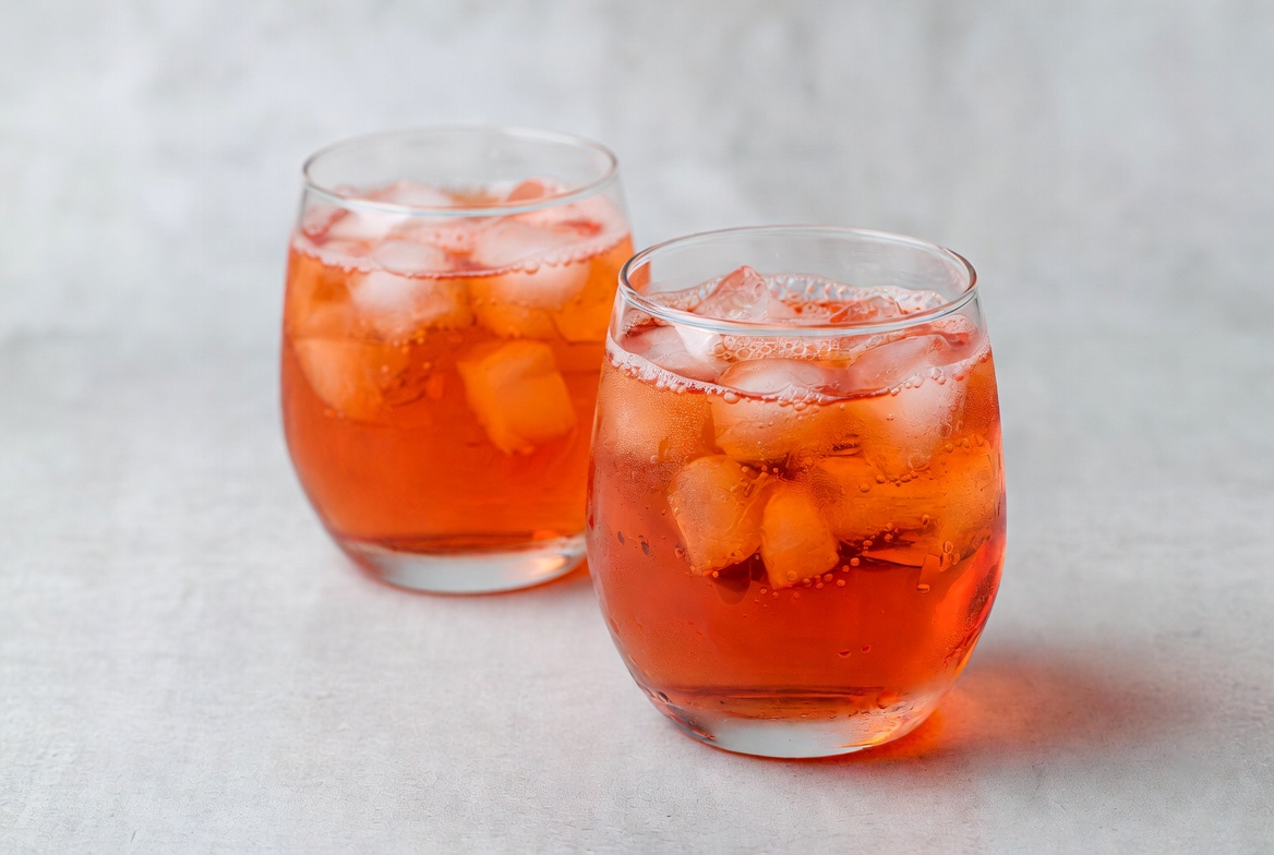 Two glasses filled with a bright orange drink and ice cubes sit on a light background. The drink is refreshing and served cold.