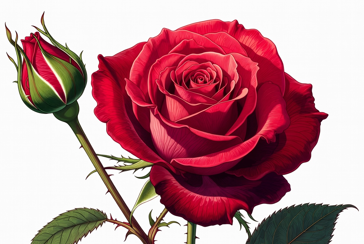 A red rose stands tall beside a young bud, showing its detailed petals and green leaves. Both display natural beauty and growth.