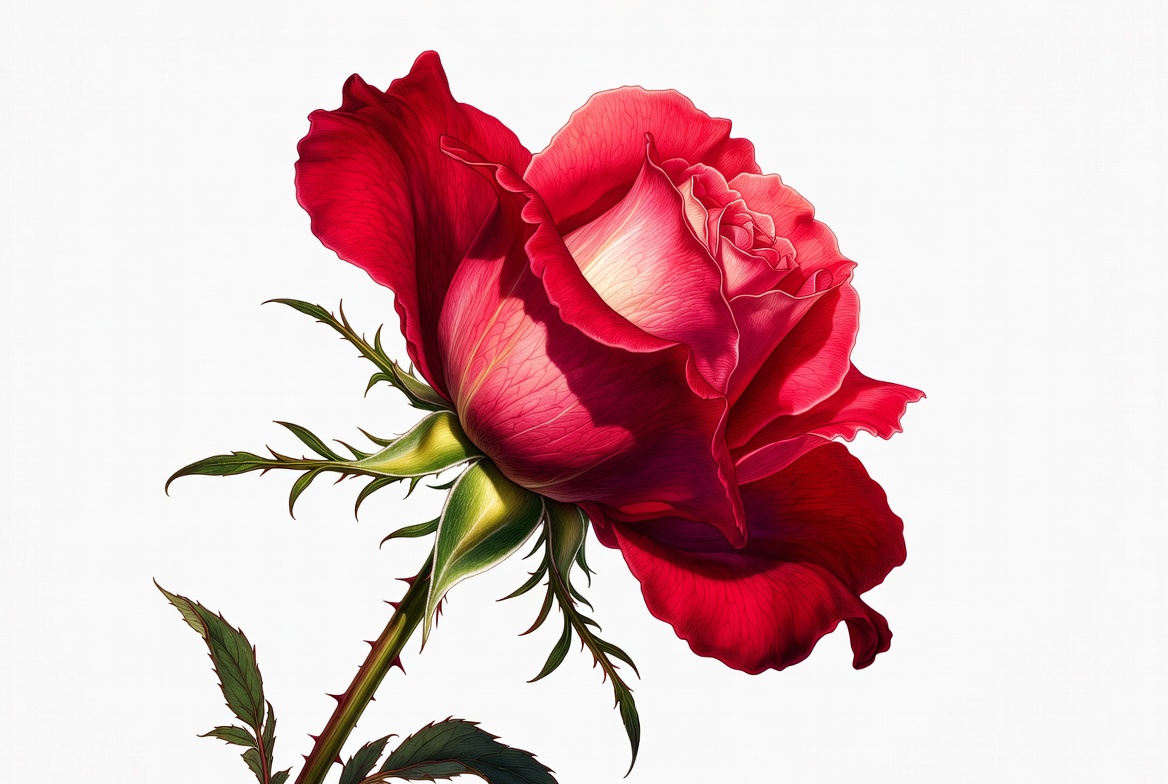 A red rose stands tall with vibrant petals and sharp thorns on its stem. The setting is bright, showcasing the flower's beauty.