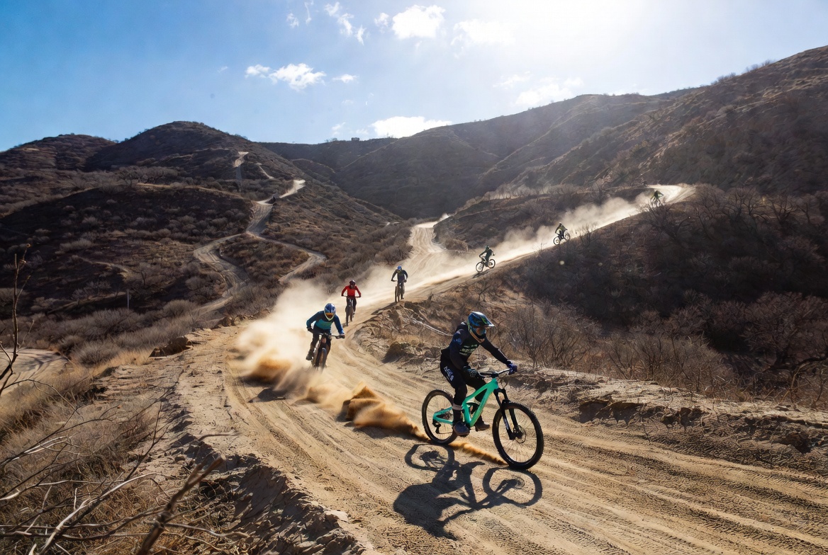 Riders enjoy mountain biking on dirt trails in hilly terrain under bright sunlight, creating dust clouds.