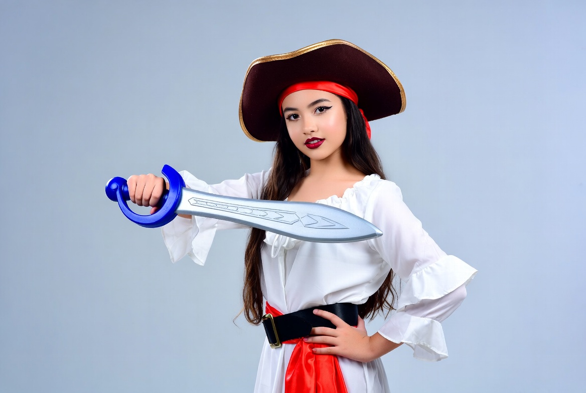 A woman stands confidently in a pirate costume, holding a sword. She poses with a serious expression on her face, ready for adventure.