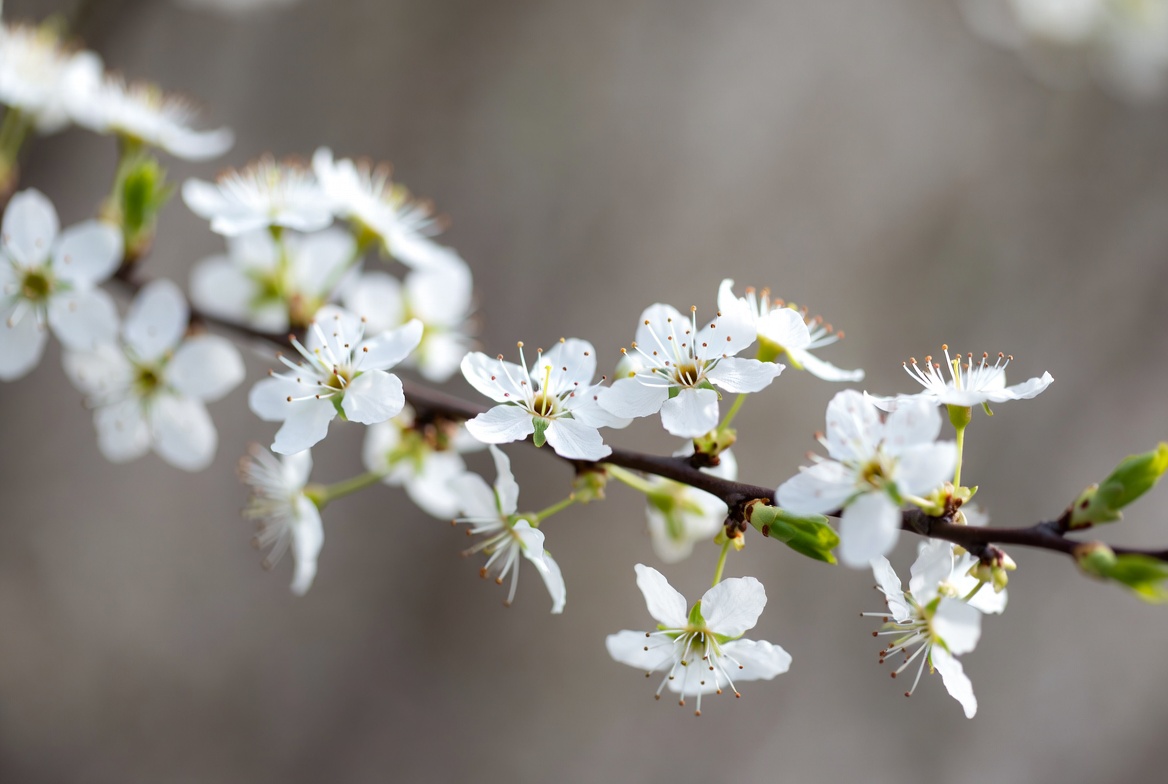 A branch with white flowers is seen against a blurred background. The flowers are in full bloom, showcasing their delicate petals.