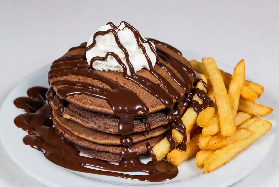 French fries, breakfast, chocolate pancakes, chocolate sauce, comfort food, crispy fries, culinary, dessert, dining, food, gourmet, meal, plate, restaurant, savory side, starchy meal, sweet dish, sweet flavor, texture, whipped cream
