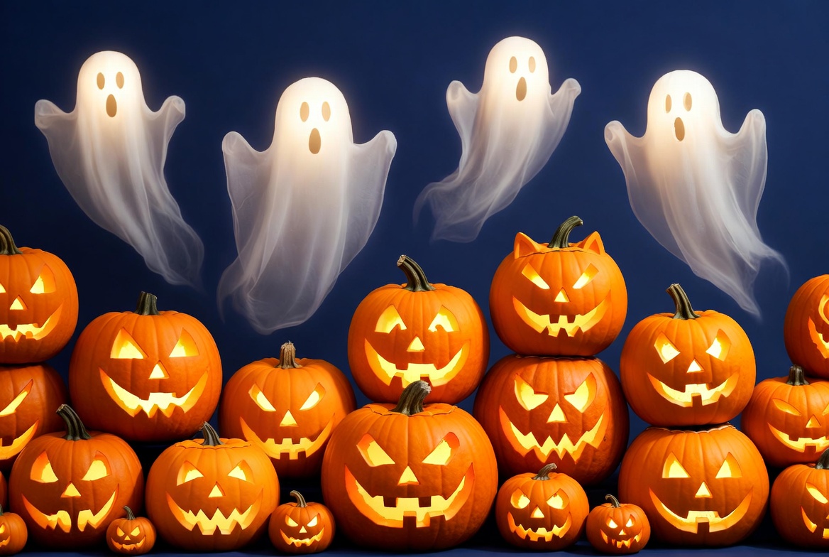 Four ghosts float above a row of glowing pumpkins. Each pumpkin features different faces. The scene captures a festive Halloween setting.