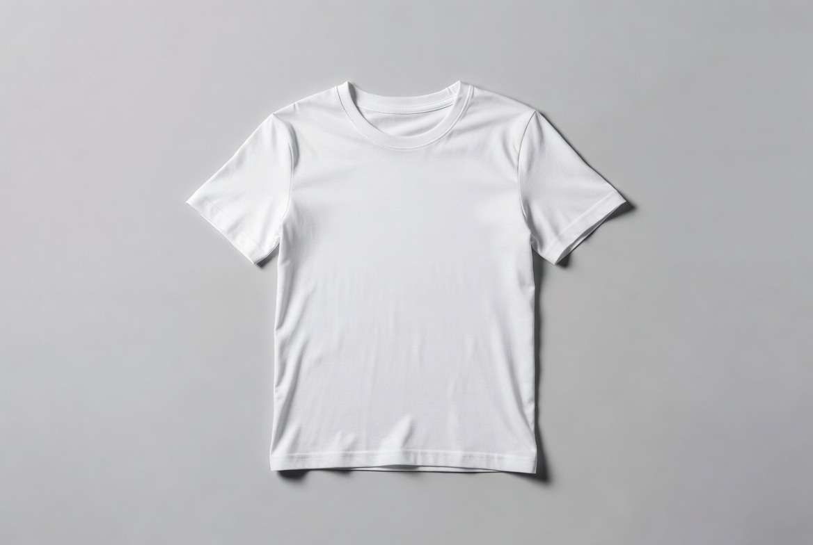 A plain white t-shirt is displayed flat on a gray background. It has a simple design with short sleeves and a crew neck.