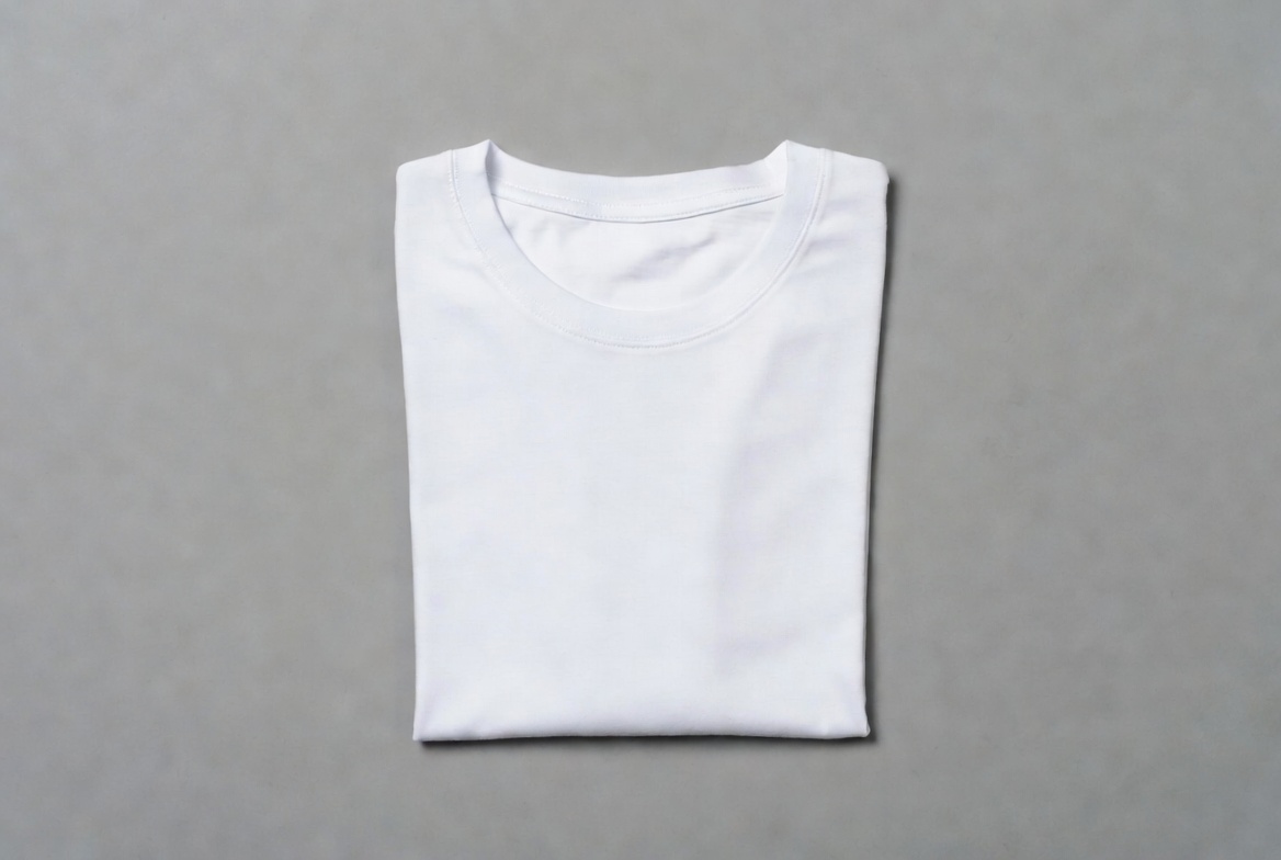 A white T-shirt is neatly folded on a gray background. It shows a simple design and standard shape with no print or logo.
