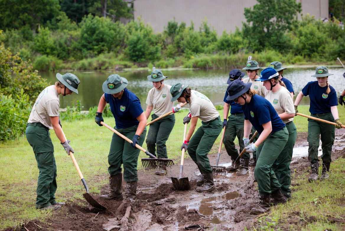 Group of volunteers clears mud and debris from a trail near a pond. They use shovels and rakes on a cloudy day for trail restoration.
