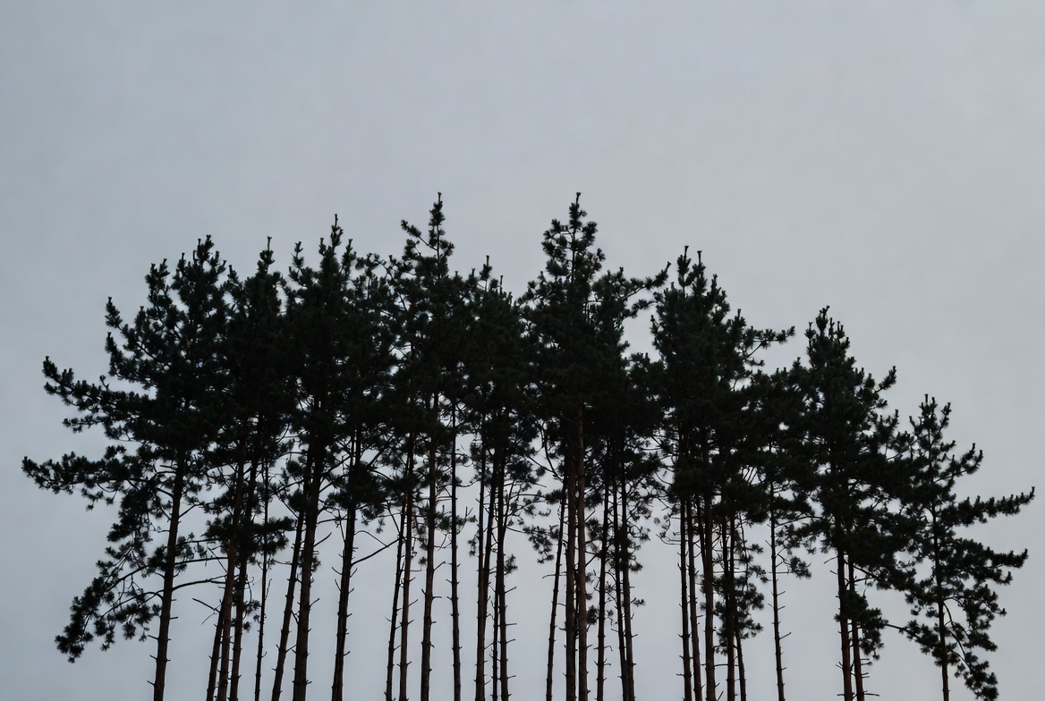 Tall trees stand in a row under a gray sky. The branches reach upward. The scene shows nature's beauty on a cloudy day.