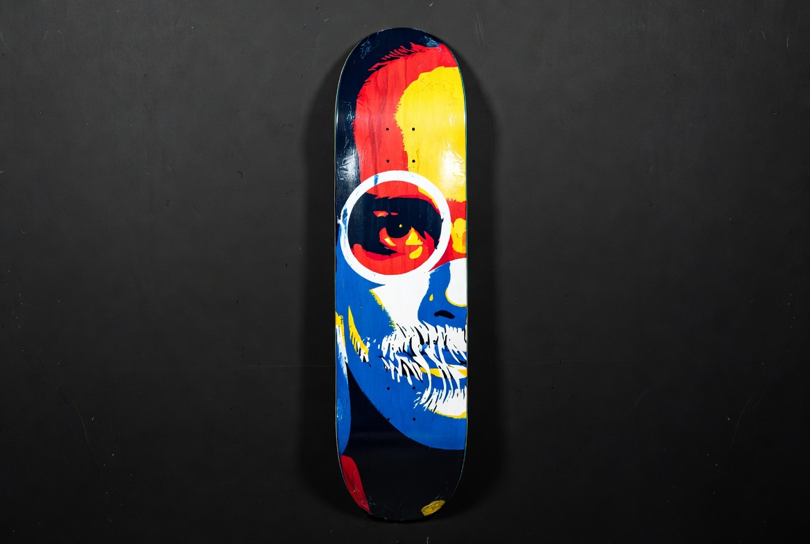 A skateboard deck features a colorful design of a person with glasses. The artwork uses bright colors and bold shapes to create the image.
