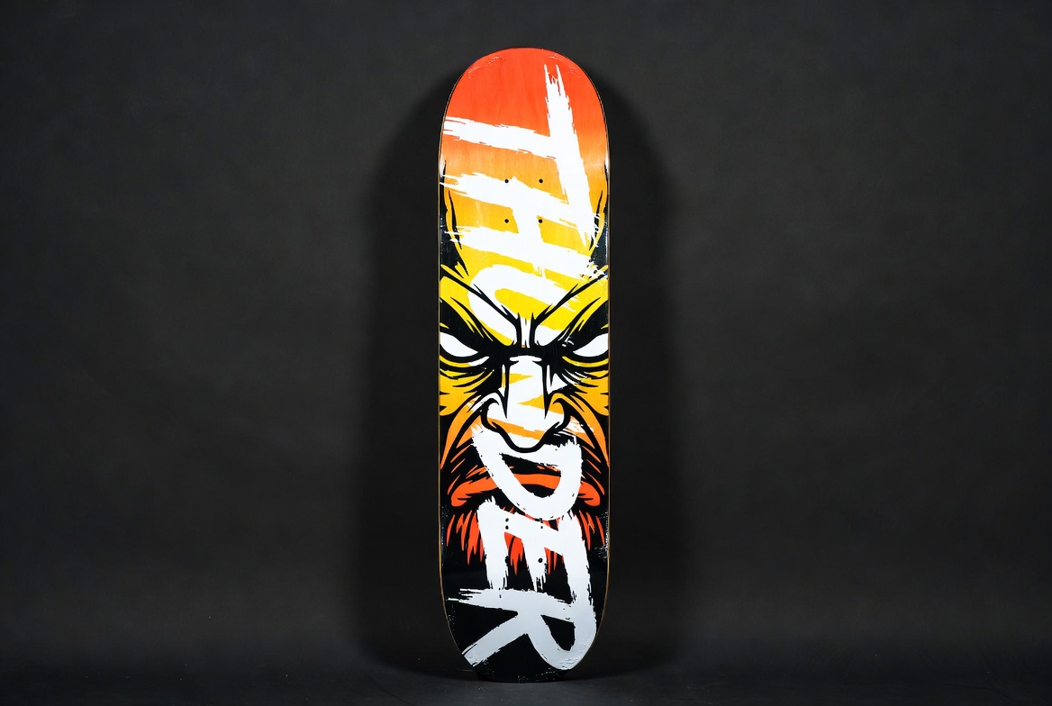 A skateboard deck displays a colorful design featuring an intense face graphic.